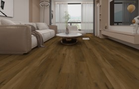 Un sol SPC brun profond à l’allure rustique chic. Ranch 5 mm réchauffe les espaces avec puissance et style.
